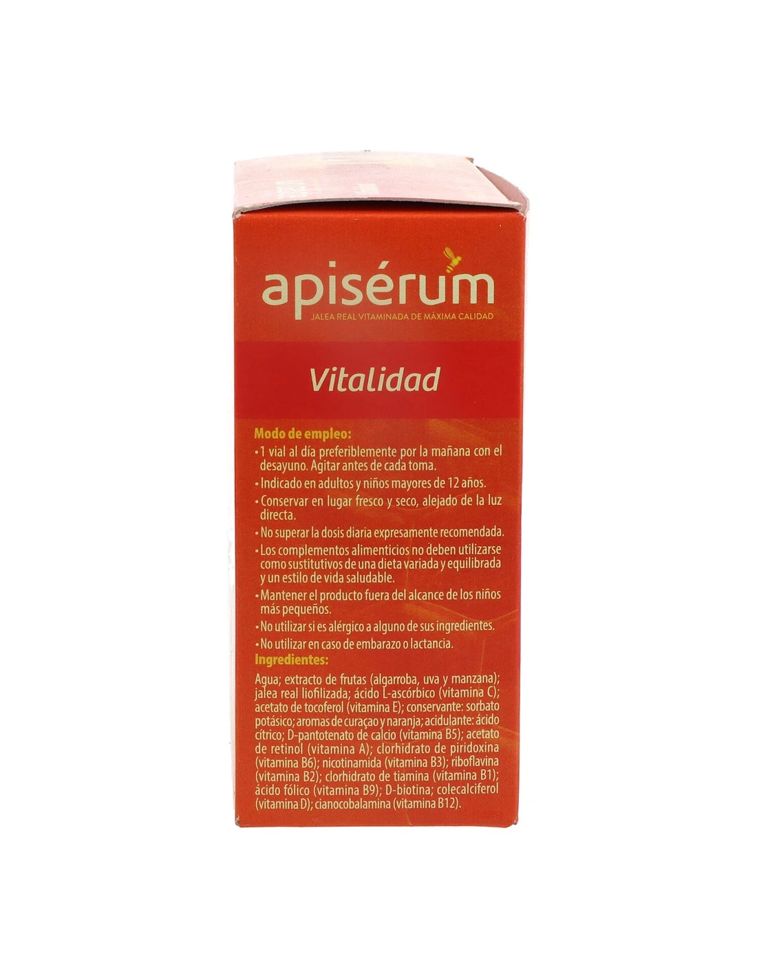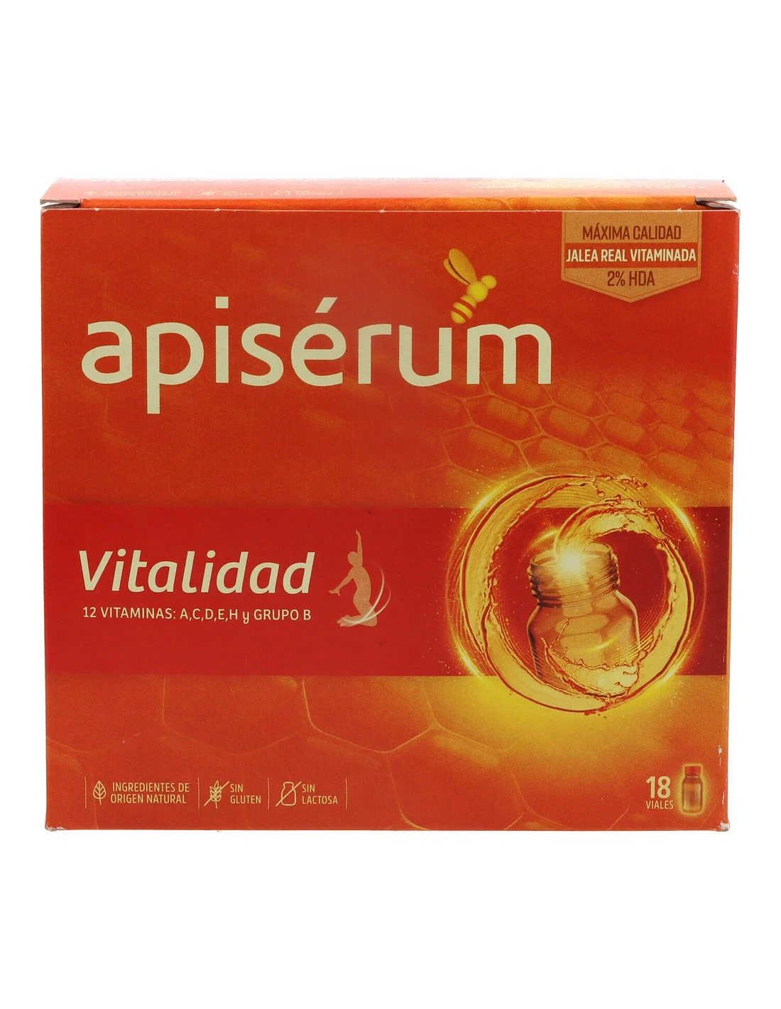 Apiserum Vitalidad 18 Viales favorece y mantiene la vitalidad en casos de cansancio y fatiga, gracias a su composición rica en jalea real y vitaminas.