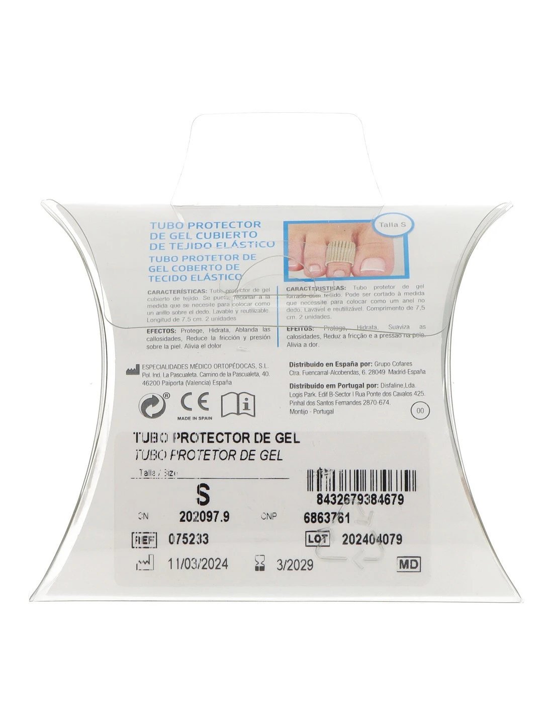 Este tubo protector está fabricado con gel cubierto de tejido elástico, proporcionando una barrera suave que protege e hidrata la piel. Su diseño permite reducir la fricción y la presión, aliviando molestias causadas por rozaduras, callosidades y helomas. Con una longitud de 7,5 cm y un diámetro de 15 mm, es adecuado para adaptarse a diferentes tamaños de dedos.