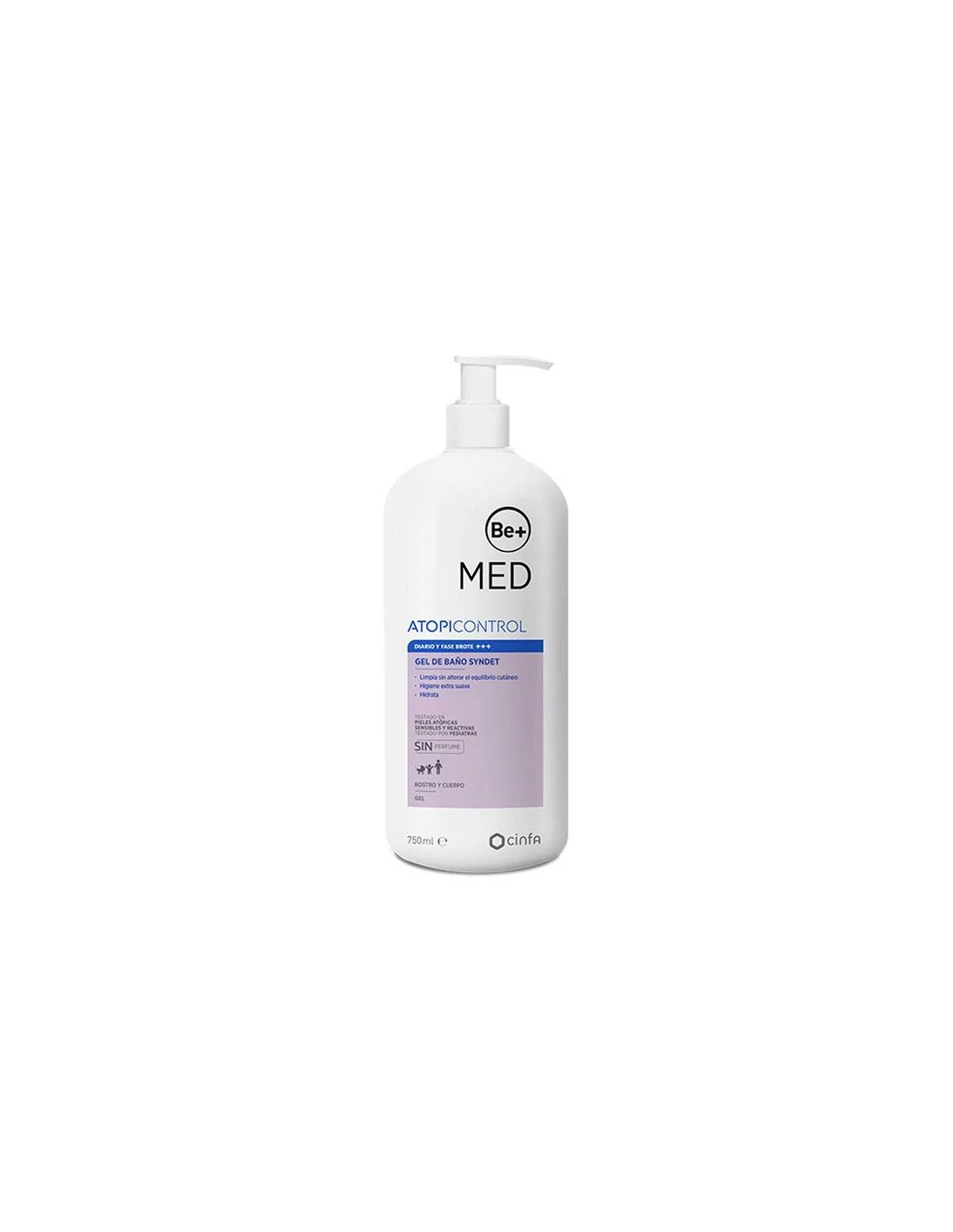 Gel de baño syndet de Be+ en formato de 750 ml, especialmente formulado para pieles atópicas. Limpia de forma suave sin alterar el equilibrio natural de la piel, aliviando el picor, la descamación y la sequedad gracias a sus aceites hidratantes. Apto para toda la familia, sin perfume.