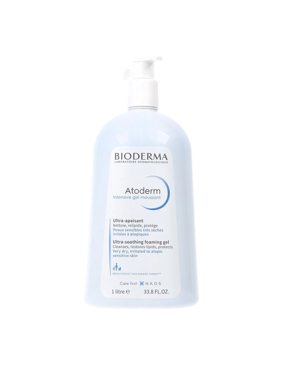 Gel Moussant Bioderma Atoderm Intensive de 1L, ideal para pieles secas y sensibles, combate los microorganismos e irritantes que empeoran la sequedad, aliviando malestar e irritación.