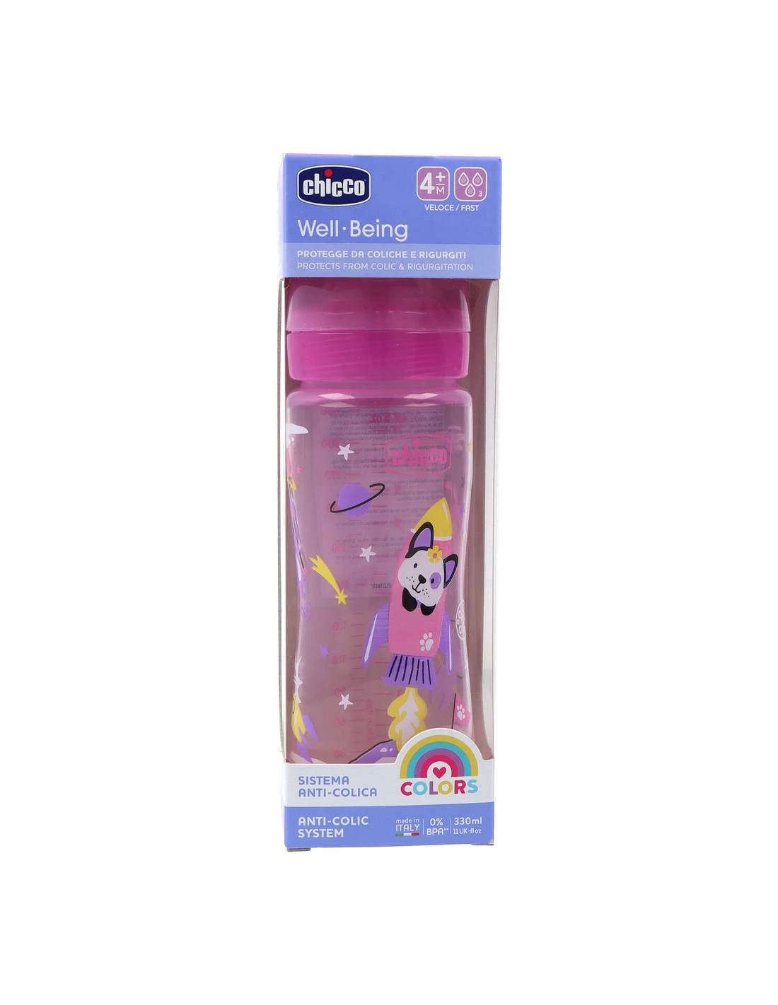 Biberón Chicco Bienestar Silicona 4m+ 330 ml Amarillo, diseñado para la alimentación segura y cómoda del bebé.