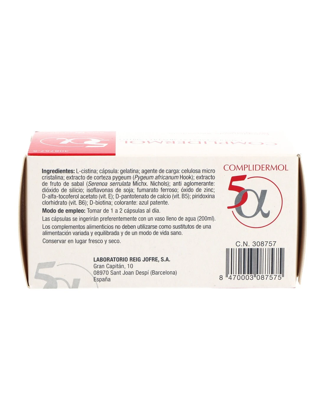 Suplemento de Complidermol 5 Alfa en cápsulas, ideal para fortalecer cabello y uñas, con vitaminas y minerales esenciales.