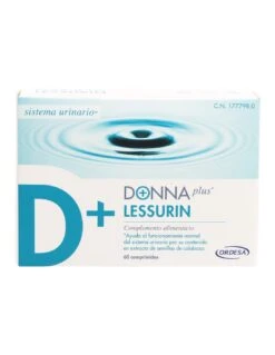 Donna Plus Lessurin es un complemento alimenticio que favorece el bienestar urinario, formulado con ingredientes naturales como soja, calabaza y vitamina C.