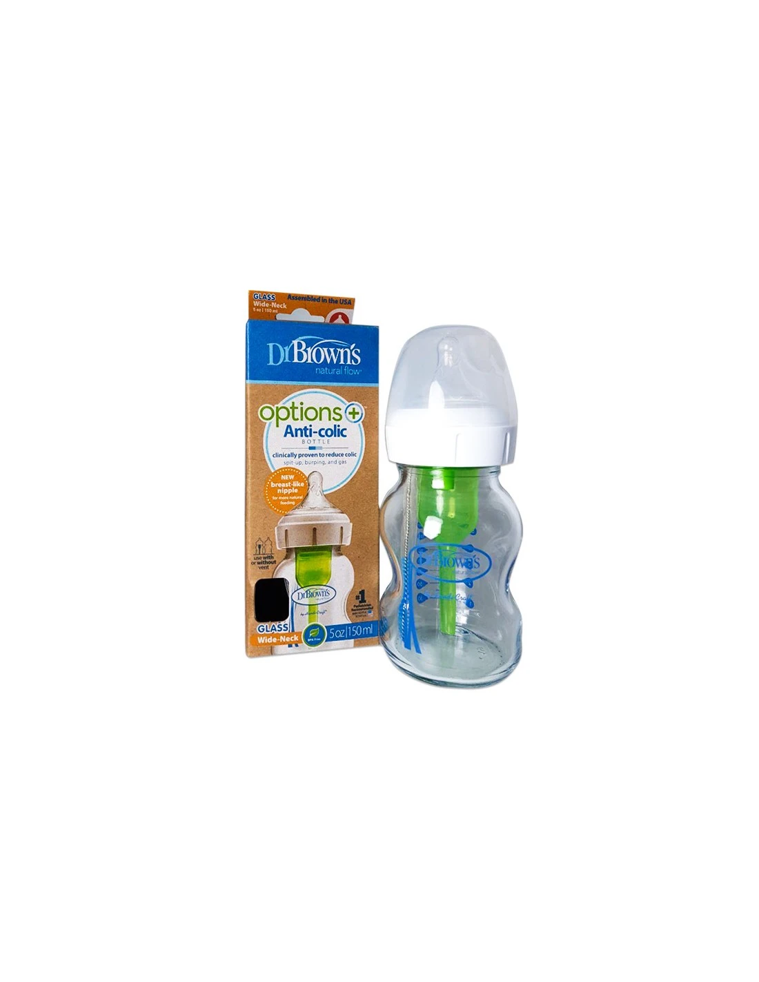 Biberón de vidrio Dr. Browns Options+ de 150 ml con boca ancha, diseñado para garantizar una alimentación segura y confortable para los bebés. Previene problemas como la aerofagia y quemaduras, ofreciendo medidas precisas para la correcta preparación de la leche en polvo.
