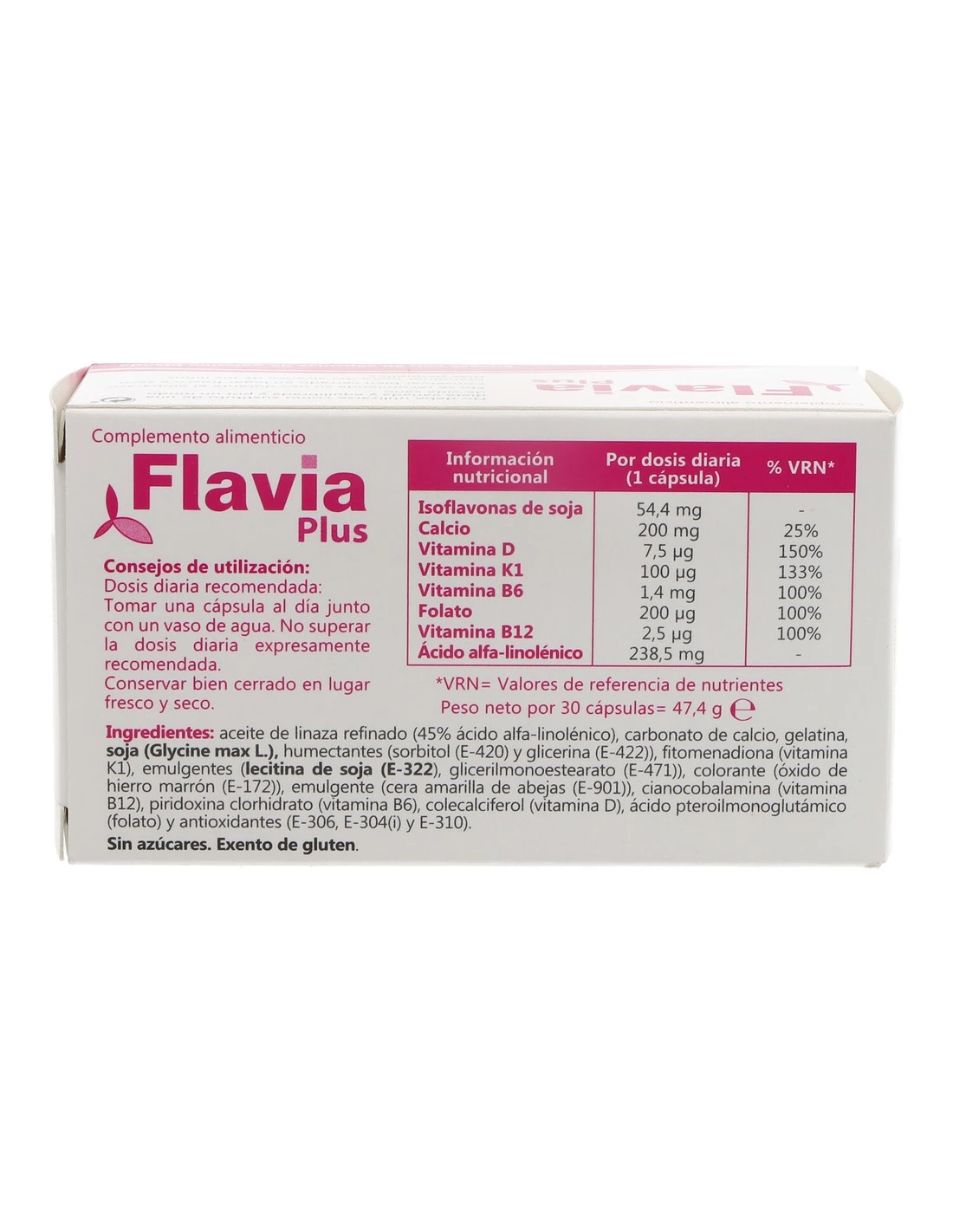 Flavia Plus contiene Isoflavonas de soja para la salud hormonal, vitamina D3 para la absorción de calcio, vitamina K para la coagulación sanguínea, vitaminas del grupo B para la división celular y síntesis de ADN, y ácido fólico para la formación de células sanguíneas y la función inmunológica.