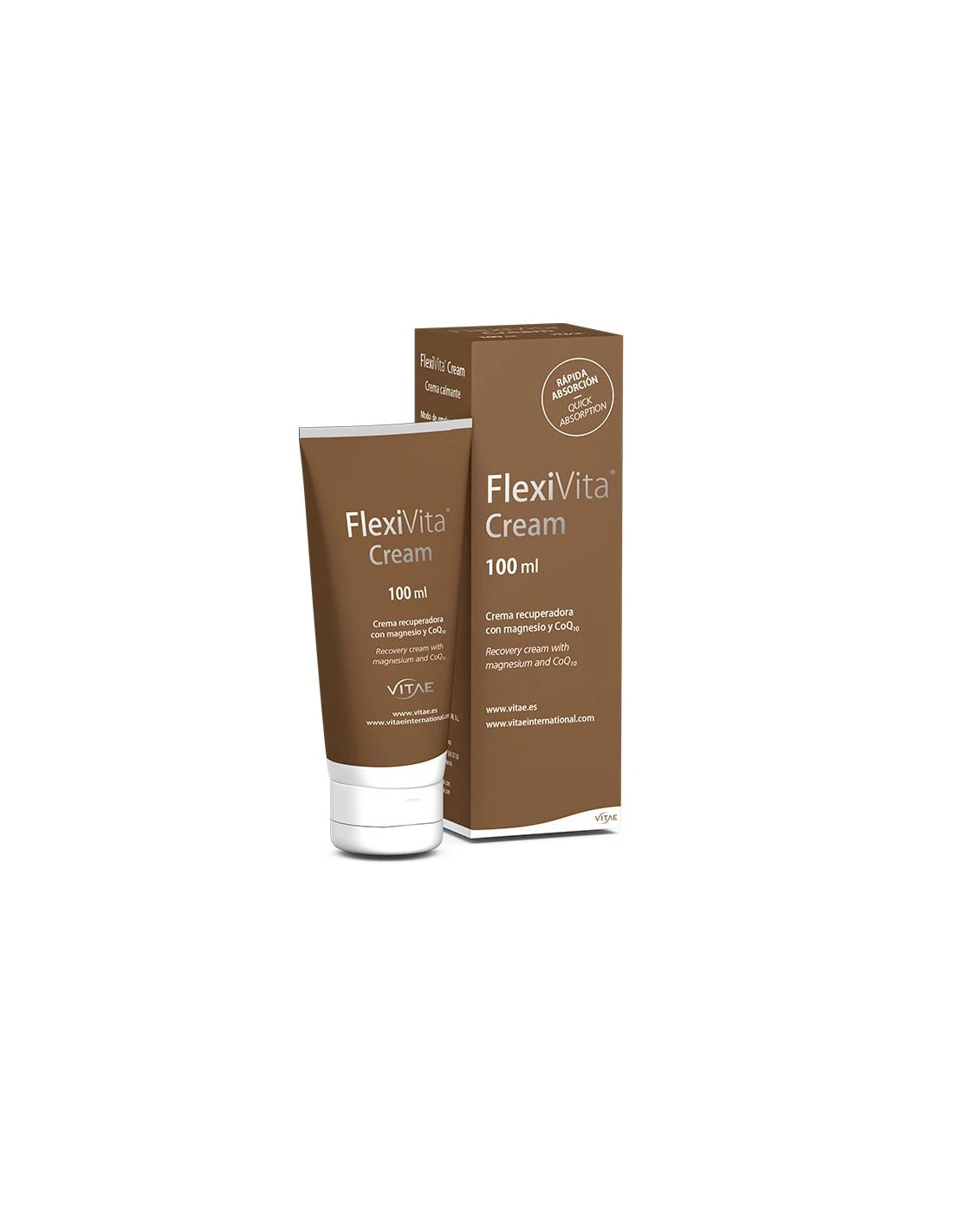 Flexivita® Cream es una crema recuperadora de rápida absorción y agradable textura y olor. Está elaborada con magnesio, coenzima Q10, glucosaminoglucanos, silicio, Boswellia, árnica y harpagofito. Magnesio: mineral indispensable que interviene en la contracción y la relajación muscular, ayuda a la transmisión del impulso nervioso y es necesario para absorber el calcio. Coenzima Q10: favorece la oxigenación de los tejidos, la resistencia y la recuperación tras el esfuerzo, la tolerancia al ejercicio y la función cardíaca. Glucosaminoglicanos: biomoléculas que ayudan a mantener y regenerar las estructuras osteomusculares ya que se encuentran mayoritariamente en el tejido conectivo, epitelial y óseo. Boswellia: Potente antioxidante natural con efecto analgésico (aumenta el umbral de dolor). Silicio: potente analgésico y cicatrizante que favorece la síntesis de colágeno y elastina, protege los huesos, las articulaciones, los músculos, los tendones, los cartílagos… entre otros. Árnica: potente antiinflamatorio con propiedades analgésicas y antimicrobianas. Estimula la circulación, elimina los moratones y reduce el dolor producido por distensiones musculares entre otras. Harpagofito: extracto con propiedades antiinflamatorias y analgésicas en articulaciones y músculos (inhibe la producción de citoquinas inflamatorias). Aplicar sobre la piel y dar un ligero masaje. Lavarse las manos después de su uso.