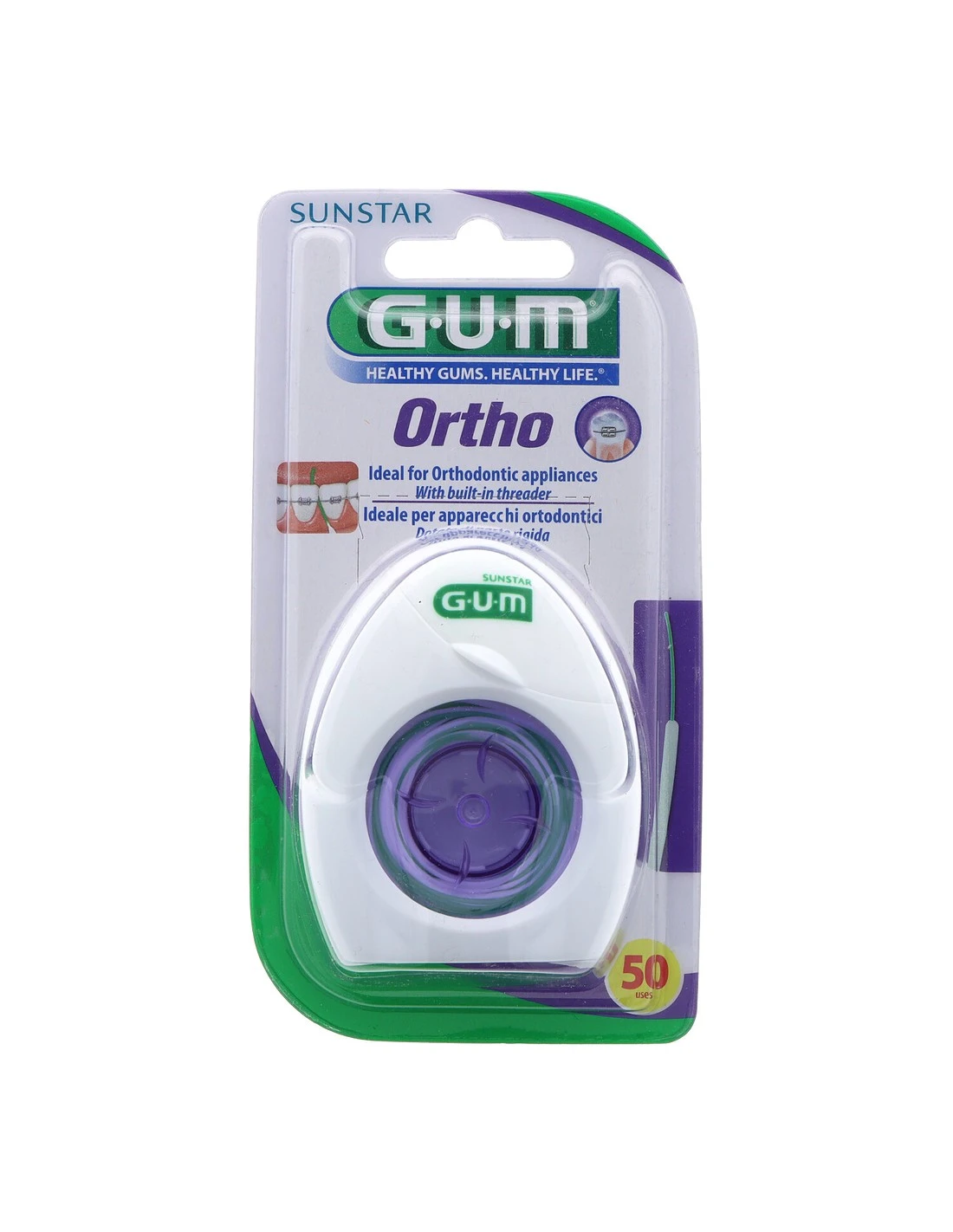 GUM® Ortho Floss Aparatos de ortodoncia, puentes fijos y los implantes dentales crean áreas difíciles de alcanzar que son un reto para limpiar. Si no se limpia como parte de una rutina de higiene oral diaria, la acumulación de la placa dental puede poner en peligro la salud y la longevidad del aparato así como de los dientes naturales aproximados. Hilo dental GUM® Ortho Floss tiene secciones rígidas como punzón en cada extremo de largo de hilo hinchado. Las secciones de punzón de dos extremos tienen la rigidez ideal para navegar fá¡cilmente debajo de los aparatos y puentes para eliminar la placa. En uso, el hilo se expande para permitir un mayor contacto y limpieza en los espacios entre las superficies del aparato y los dientes adyacentes y las encías. Hilo dental de GUM esta envasado en un dispensador de fácil uso evitando enredos y los residuos durante el almacenamiento de la seda en un contenedor higié©nico. Contiene 50 hilos dentales.