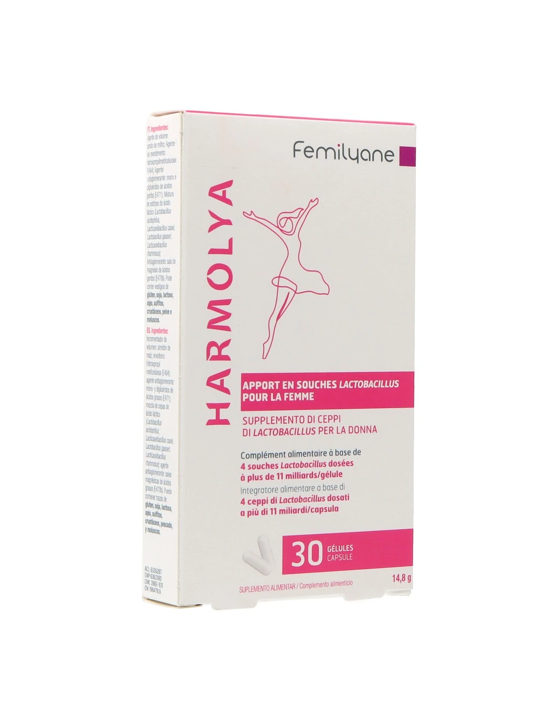 Harmolya Femilyane 30 Caps de Laboratoires Bailleul es un complemento alimenticio que apoya el bienestar ginecológico femenino con una combinación equilibrada de probióticos, vitamina B6 y Vitex agnus-castus. Estos ingredientes ayudan a regular las hormonas y aliviar trastornos menopáusicos y premenstruales.
