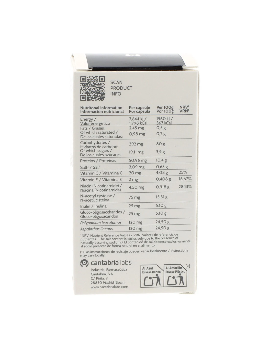 Cápsulas con Fernblock®, cisteína, vitaminas y prebióticos que mejoran la resistencia de la piel al sol desde la primera toma.