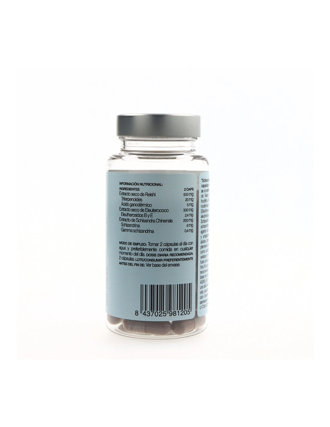 Cada cápsula contiene: – Extracto seco de reishi (Ganoderma lucidum, cuerpo fructífero) – Extracto seco de eleuterococo (Eleutherococcus senticosus Rupr., raíz) – Extracto de schisandra (Schisandra chinensis (Turcz.) Baill., fruta) Otros ingredientes: agente de recubrimiento (hidroxipropilmetilcelulosa), agente de carga (celulosa microcristalina), antiaglomerante (sales magnésicas de ácidos grasos).
