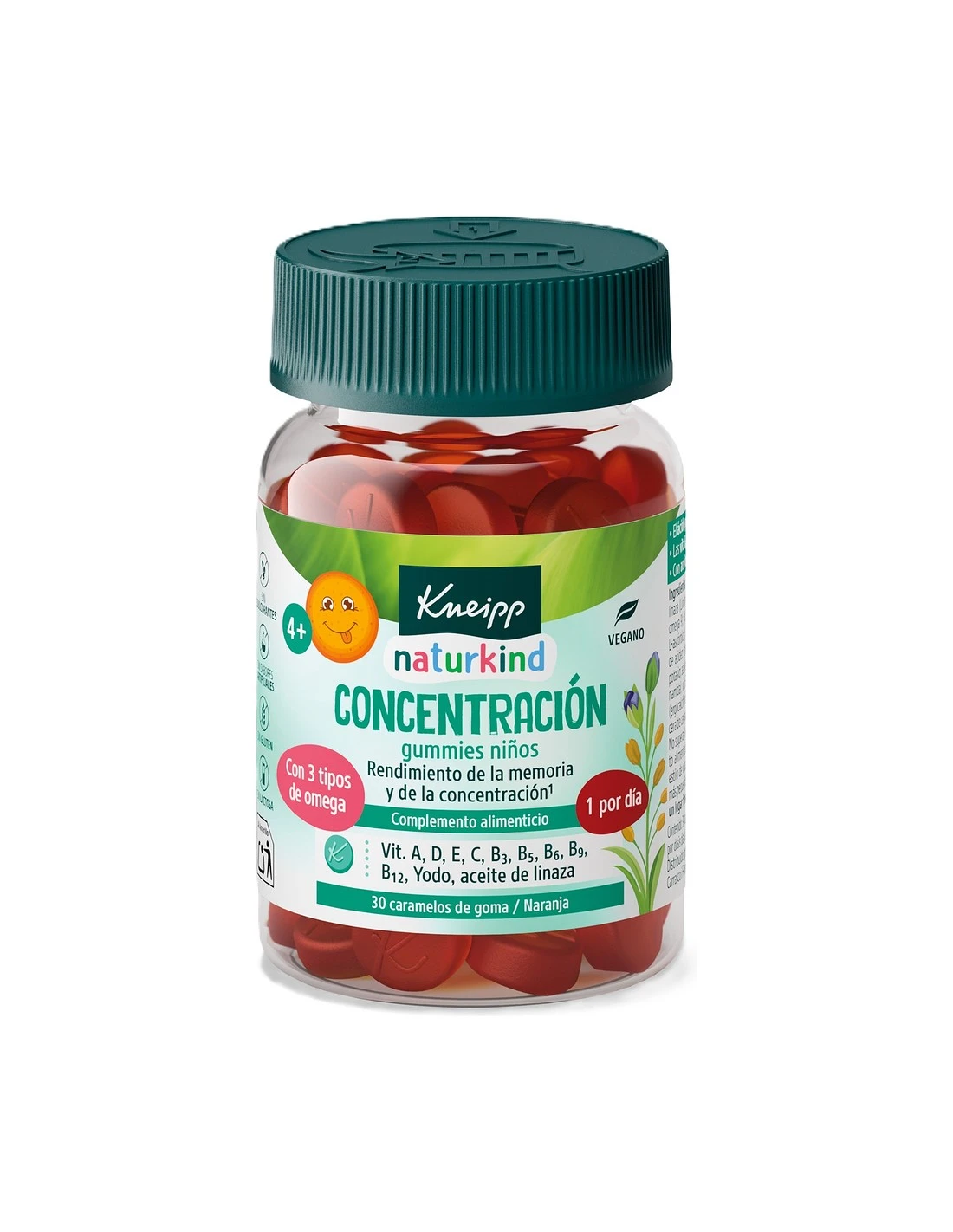 Kneipp Gummies Niños Concentración es un complemento alimenticio en forma de gominolas con sabor a naranja, diseñado para potenciar la concentración y el rendimiento cognitivo en los más pequeños. Contiene vitamina B5, que contribuye al rendimiento intelectual normal, y vitaminas B6, B12 y C, que apoyan el funcionamiento normal del sistema nervioso. Además, incorpora aceite de linaza, fuente de omegas 3, 6 y 9. Estas gominolas son aptas para dietas veganas y no contienen sabores artificiales, edulcorantes, gluten ni lactosa. :contentReference[oaicite:0]{index=0}