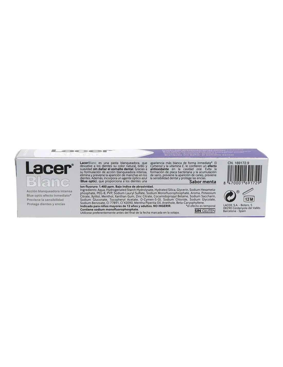 La actuación blanqueante de LacerBlanc Plus previene y quita las manchas de los dientes causadas por el tabaco y a la consumo de ciertos alimentos, vino, café o té, respetando los dientes. Asimismo la pasta dentifrica LacerBlanc Plus previene la caries y sensibilidad dental, previene y quita la placa dental, protege las encías. LacerBlanc Plus además está recomendada para conservar y prolongar el tratamiento blanqueante realizado profesionalmente. PRESENTACIÓN: Tubo de 125 ml.