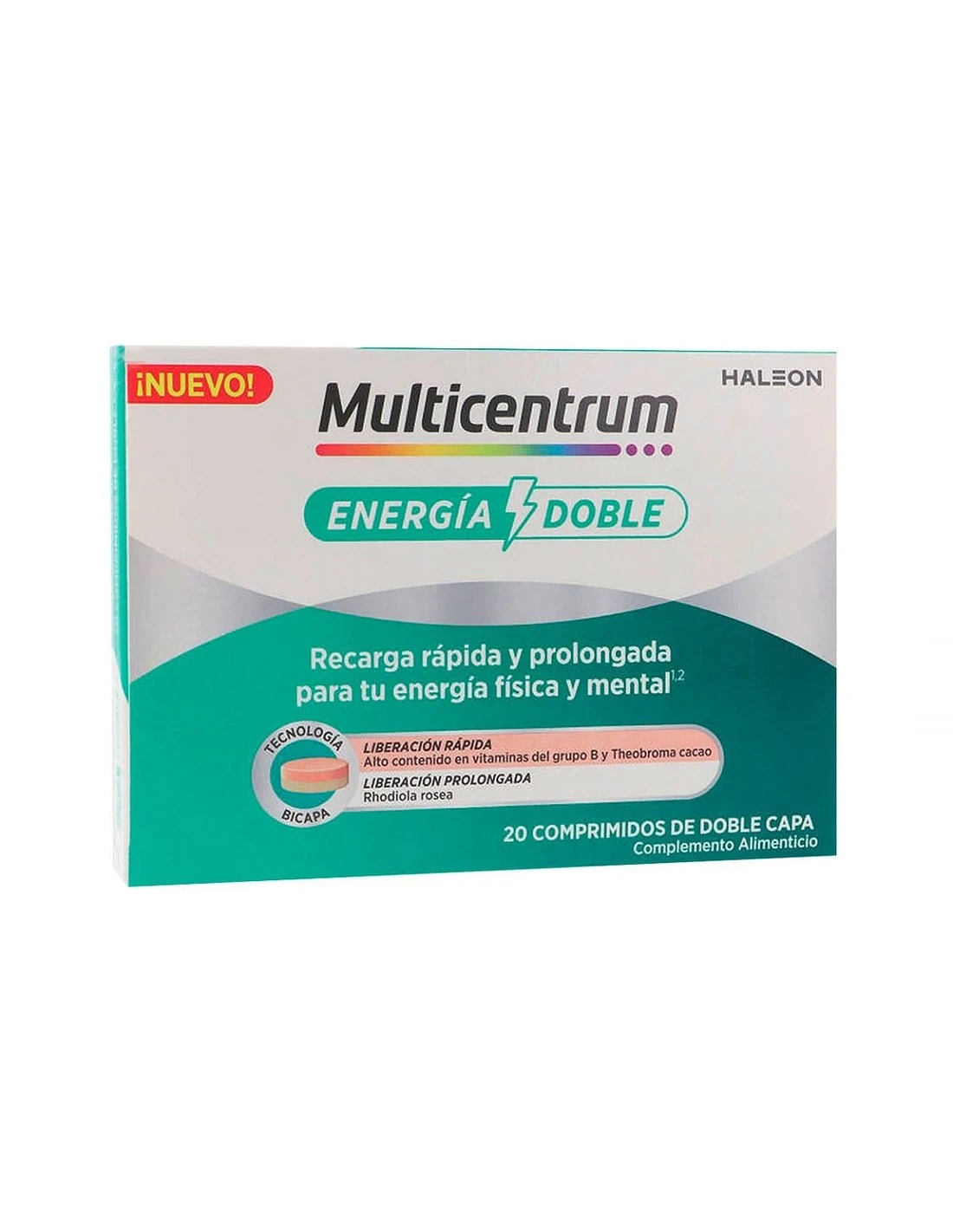 Multicentrum Energía Doble ayuda a reducir la fatiga física y mental gracias a su formulación rica en vitaminas B (B1, B2, B3, B5, B6, B12 y biotina), que contribuyen al metabolismo energético normal. El extracto de Theobroma cacao proporciona un impulso rápido, mientras que el extracto de Rhodiola rosea actúa de manera prolongada, ayudando al organismo a adaptarse al estrés y mejorar la resistencia física.