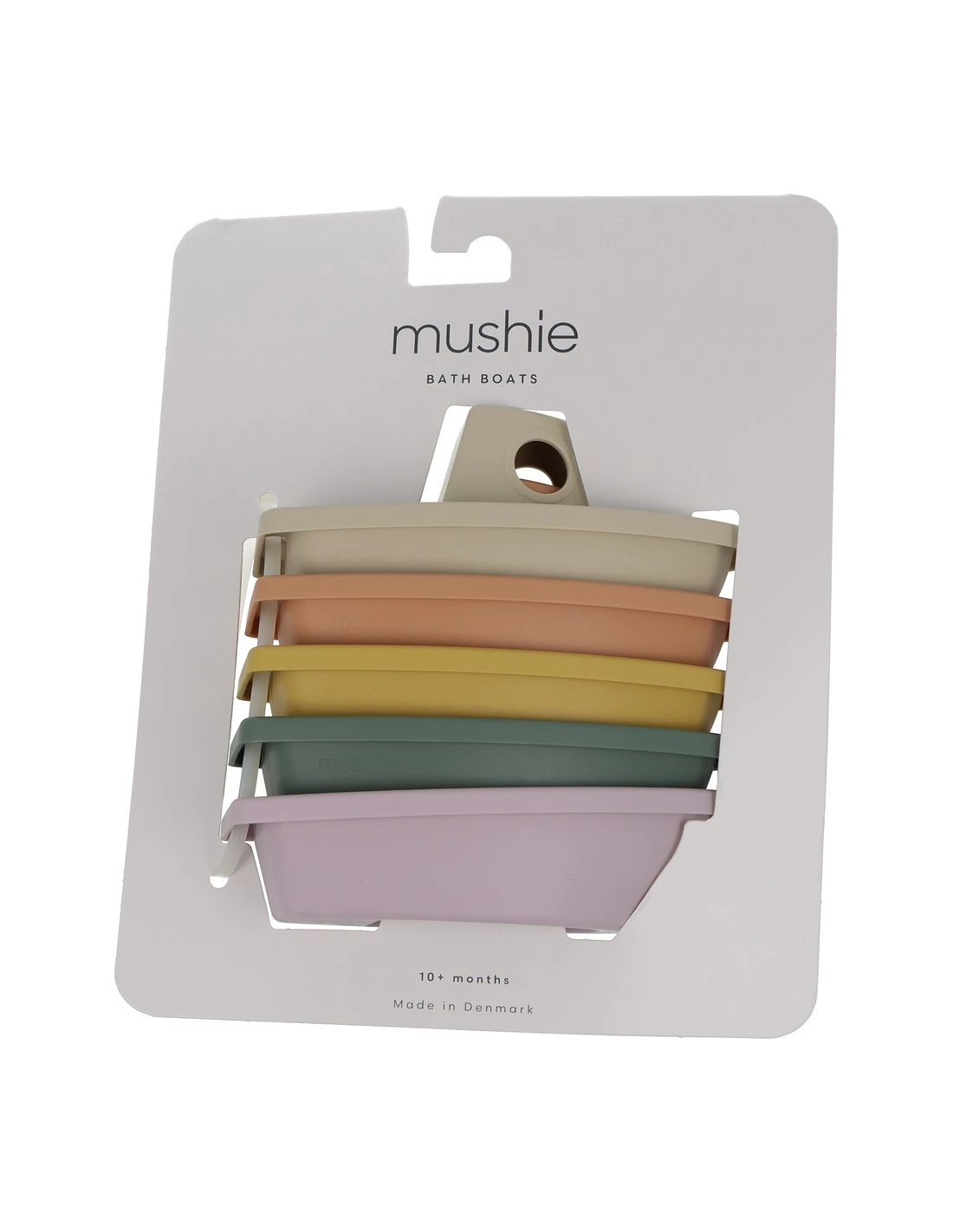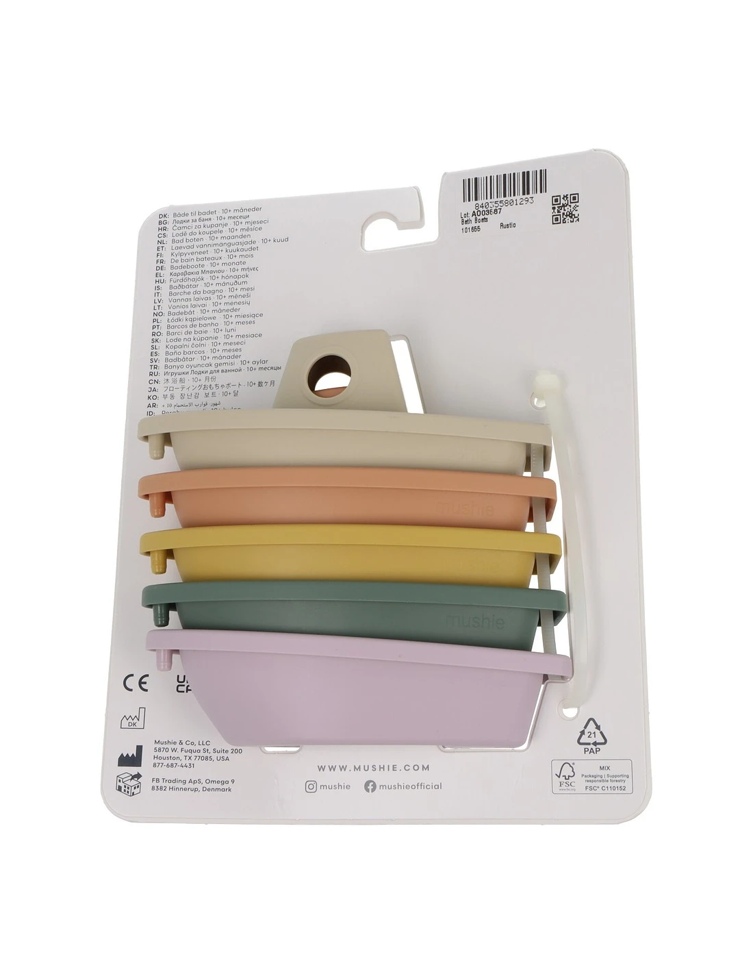 El set de barcos de baño Mushie, compuesto por cinco unidades en suaves colores rústicos, está diseñado para ofrecer diversión y aprendizaje a los niños durante el baño. Estos barcos se pueden apilar y conectar, formando una fila flotante que estimula la creatividad, la coordinación y las habilidades motoras finas, convirtiendo el momento del baño en una experiencia interactiva y educativa.