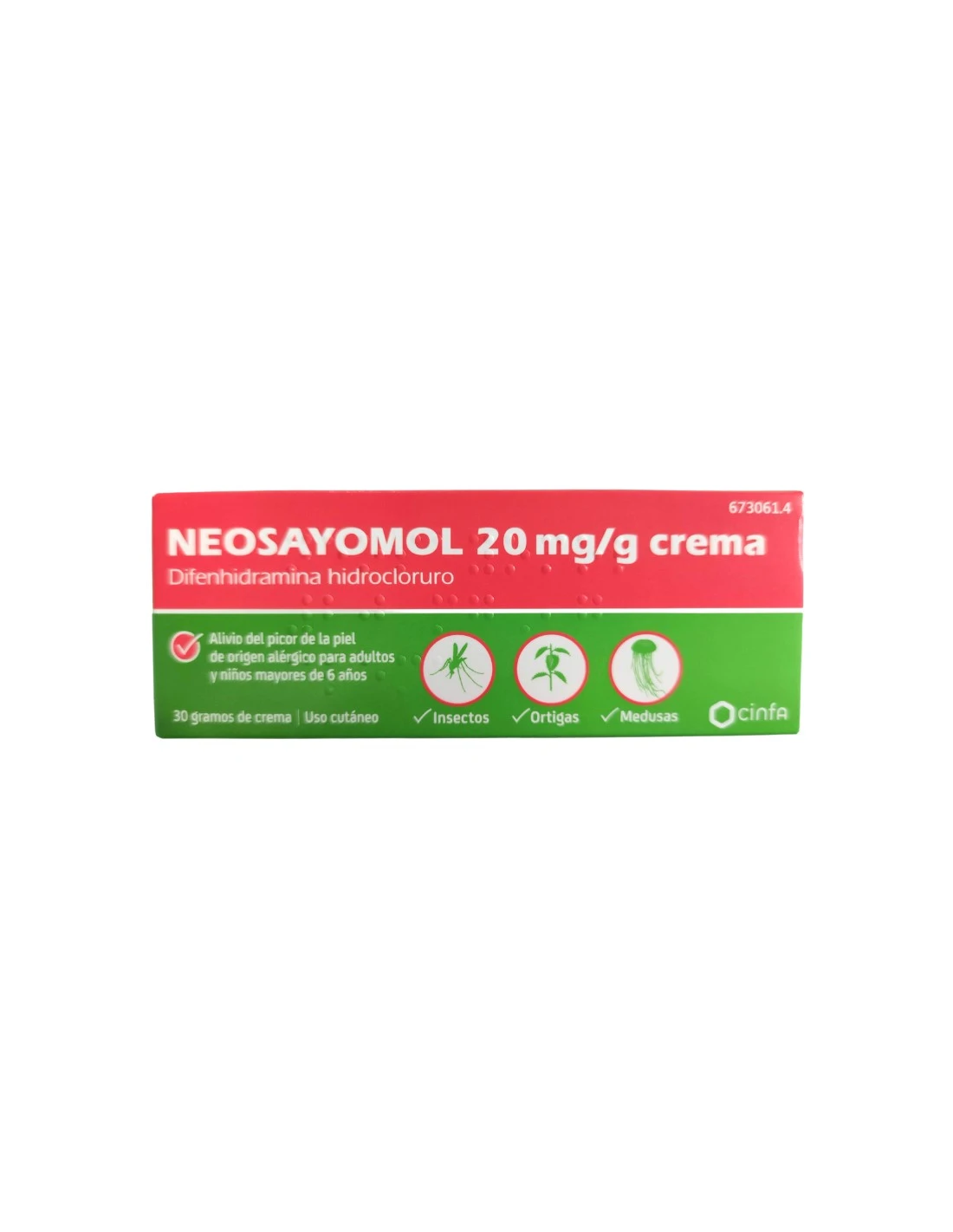 Neosayomol es una crema compuesta por un antihistamínico, la difenhidramina que por su forma de actuar resulta efectivo para aliviar el picor en cuadros alérgicos.