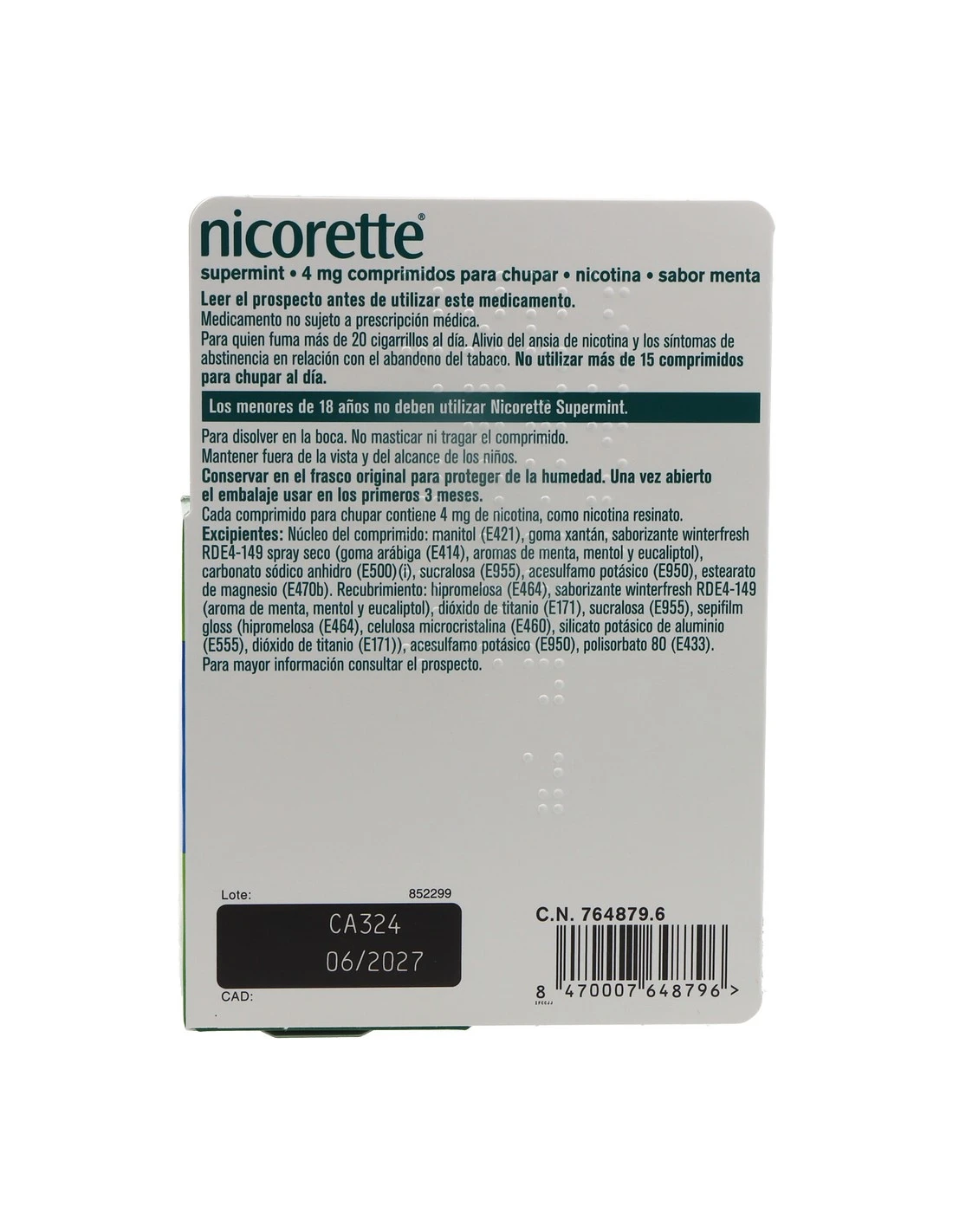 Nicorette Supermint 4 mg son comprimidos para chupar indicados para ayudar a fumadores adultos con alta dependencia a la nicotina a dejar de fumar. Al disolverse en la boca, liberan nicotina que se absorbe a través de la mucosa bucal, aliviando los síntomas de abstinencia y reduciendo las ansias de fumar. Están especialmente recomendados para quienes fuman más de 20 cigarrillos al día o necesitan fumar en los primeros 30 minutos tras despertarse.