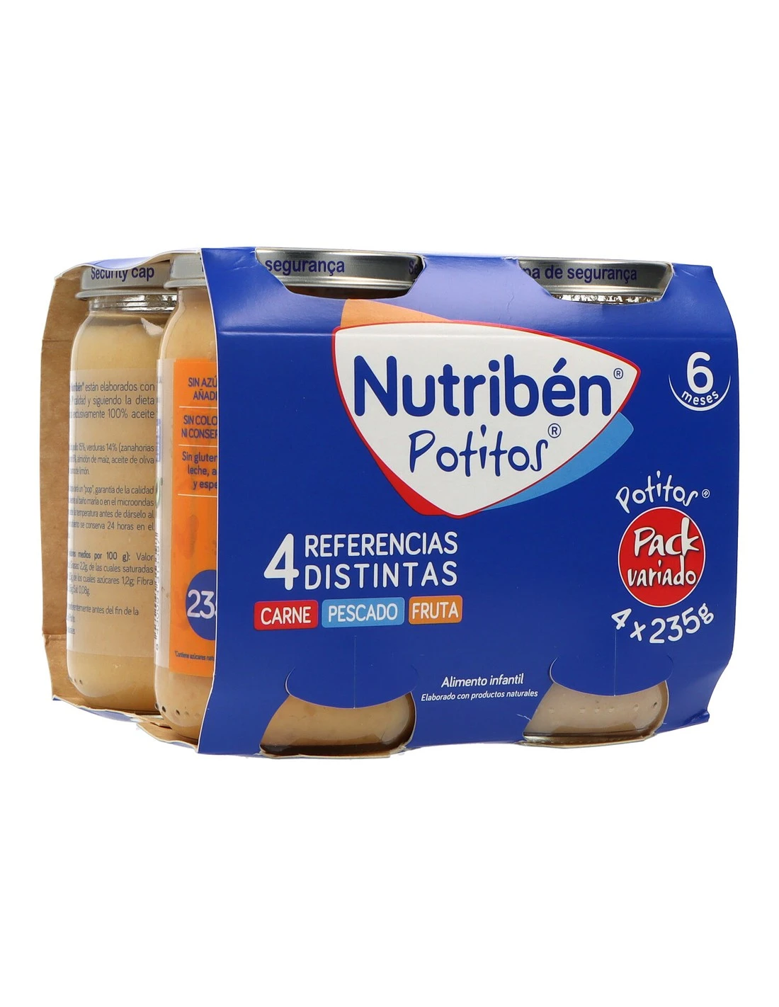 Contiene 4 potitos variados: Pollo con guisantes y zanahorias, Ternera con judías verdes y zanahoria, Suprema de merluza con arroz y Macedonia de frutas.