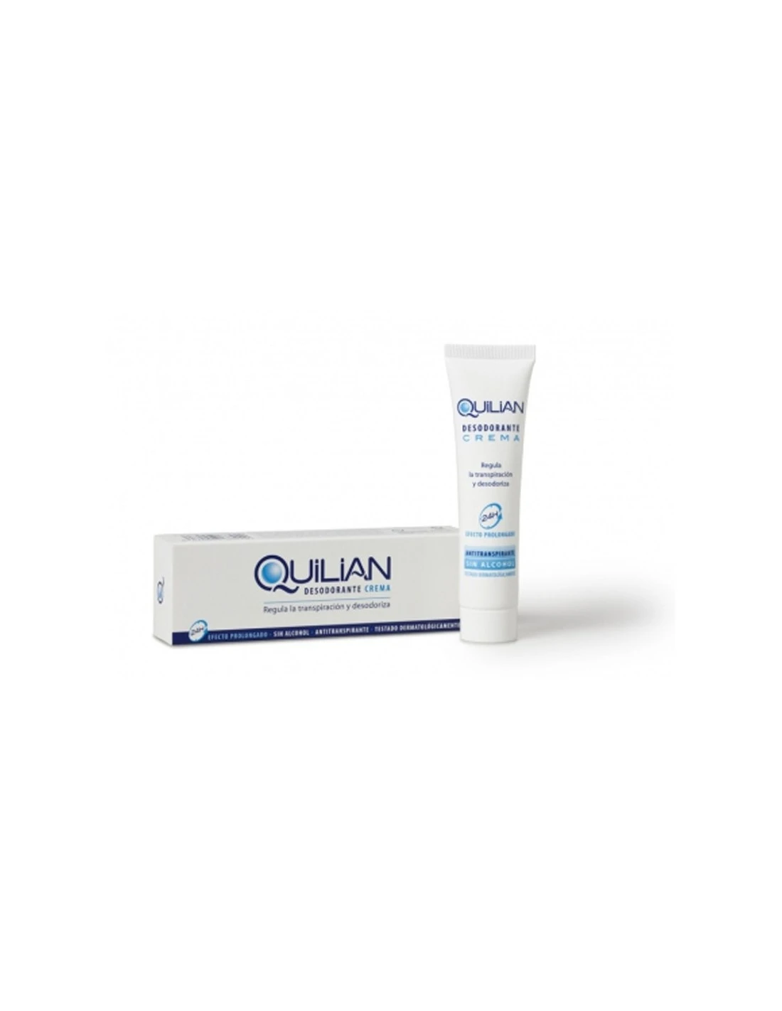 Quilian Desodorante Crema regula la transpiración corporal y evita la descomposición del sudor, suprimiendo el desagradable olor característico. Su textura suave y penetrante no mancha ni engrasa la piel. No contiene alcohol.