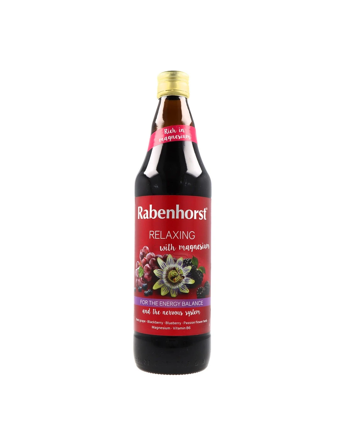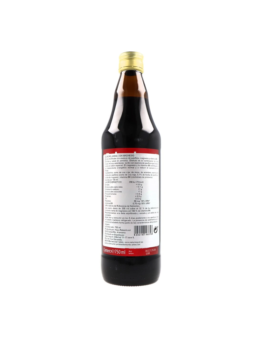 Rabenhorst Zumo Ecológico Relaxing with Magnesium es una bebida natural que combina zumos de frutas como la uva roja, la mora y el arándano con extracto de pasiflora, conocida por sus propiedades calmantes. Está enriquecido con magnesio y vitamina B6, dos nutrientes esenciales que colaboran en el funcionamiento adecuado del sistema nervioso y ayudan a reducir el agotamiento físico y mental. Su agradable sabor frutal lo convierte en una excelente opción para disfrutar de un momento de calma en cualquier momento del día.