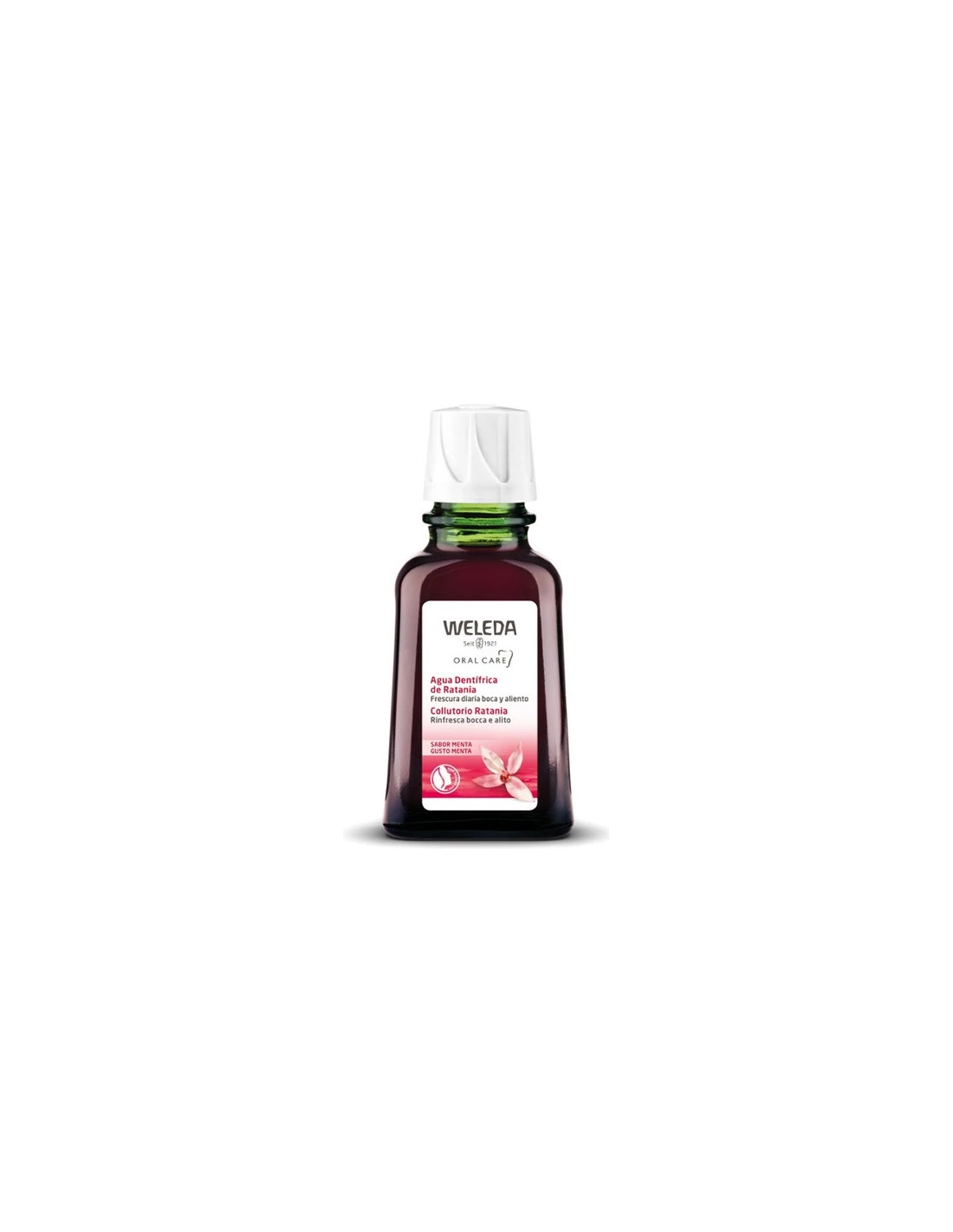 Enjuague bucal refrescante y purificante Ratania Agua Dental 50 ml de Weleda, con mirra y ratania que brindan propiedades antisépticas y astringentes, ideal para mantener una buena higiene bucal.
