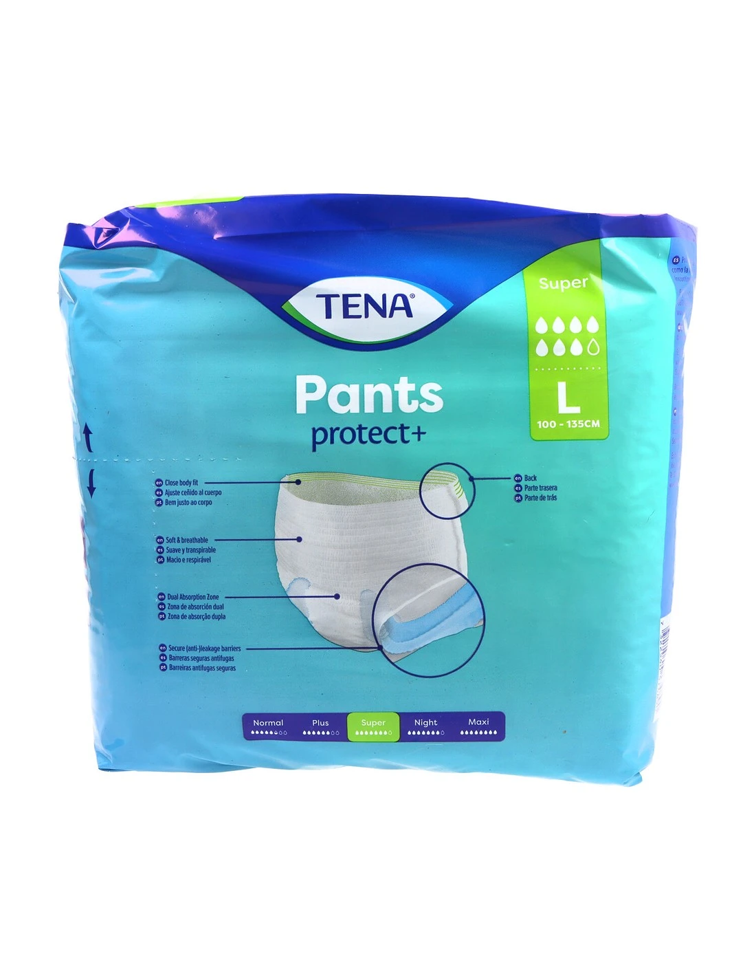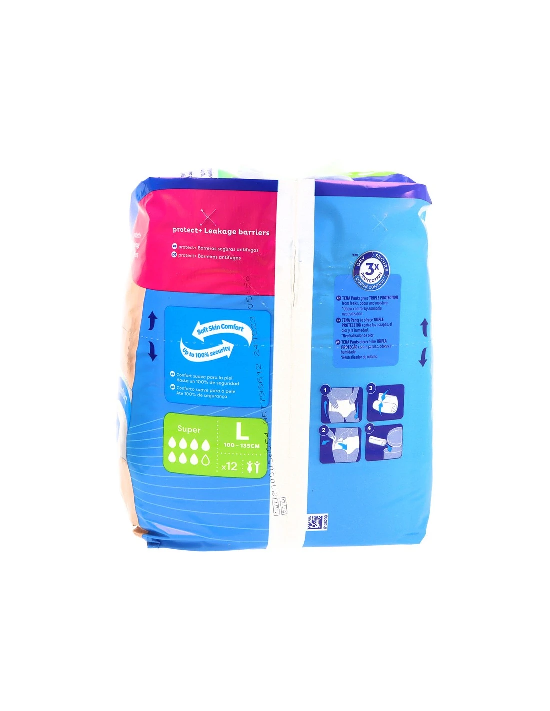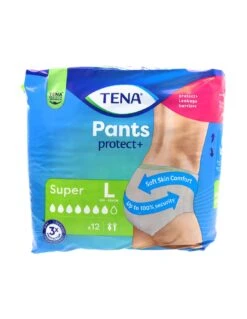 TENA Pants Super es una ropa interior absorbente cómoda y desechable de color blanco para hombres y mujeres que sufren pérdidas de orina moderadas o abundantes.