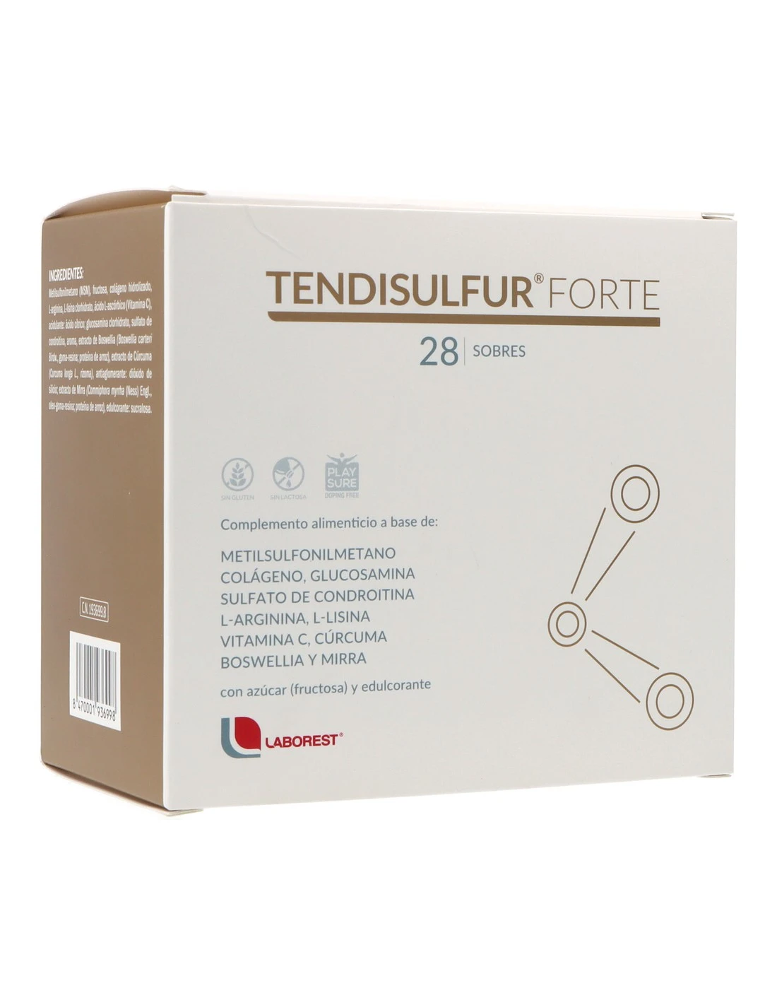 Tendisulfur® Forte es un complemento alimenticio a base de metilsulfonilmetano, colágeno hidrolizado, glucosamina clorhidrato, condroitín sulfato, L-arginina, L-lisina, extractos vegetales de boswellia, mirra y cúrcuma, y vitamina C que favorece el cuidado de tendones y ligamentos.