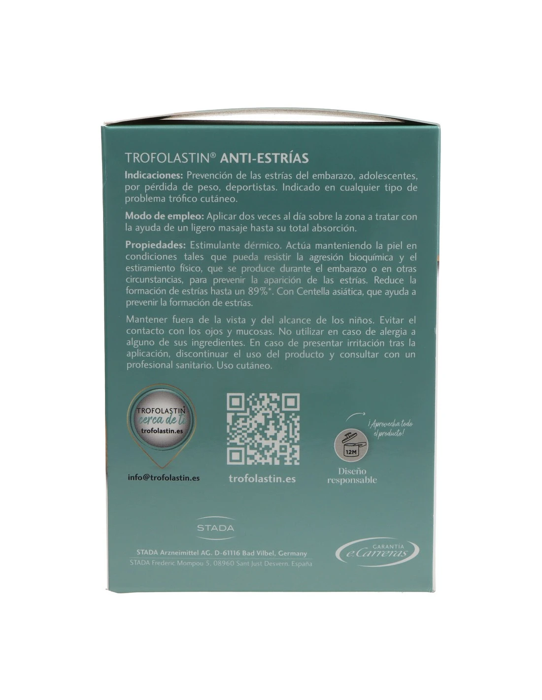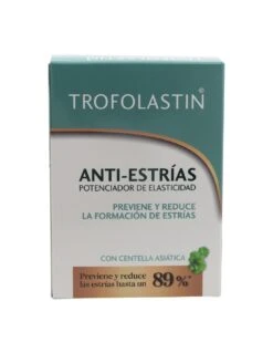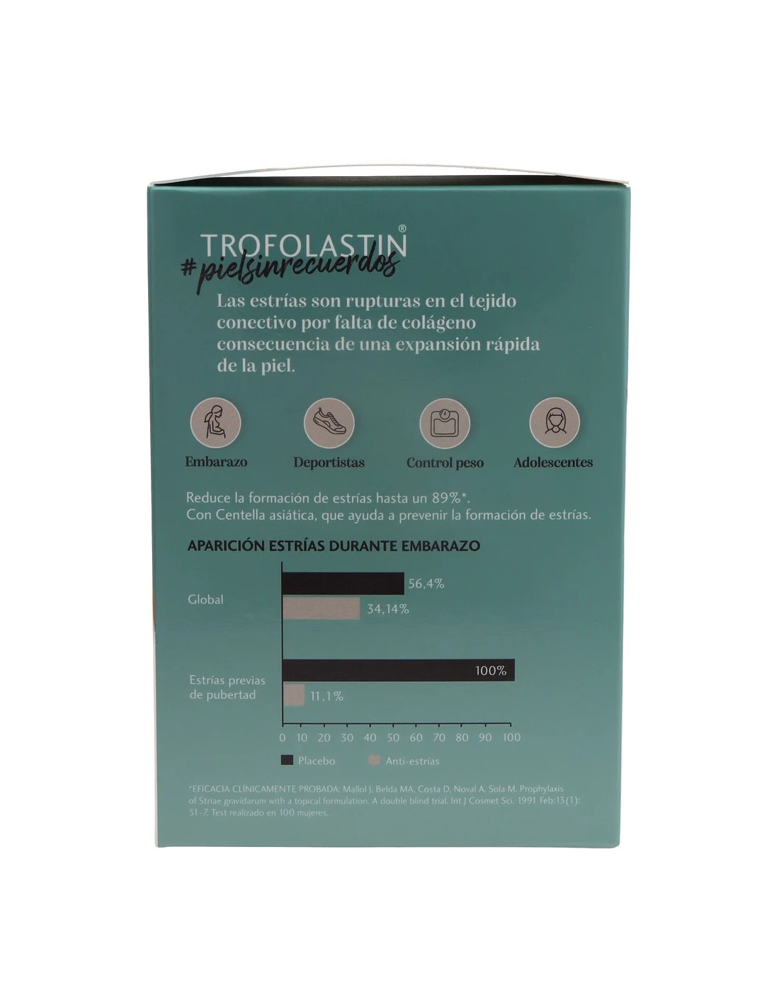 Trofolastin Antiestrías es una crema desarrollada por los laboratorios de Trofolastin, especialmente formulada para prevenir y reducir la formación de estrías. Con su gran capacidad para estimular la síntesis del colágeno, mejora la elasticidad de la piel y fortalece la dermis. Es ideal para su uso durante el embarazo, el posparto, la adolescencia, durante periodos de adelgazamiento o en cualquier época que se produzcan cambios significativos de volumen corporal.