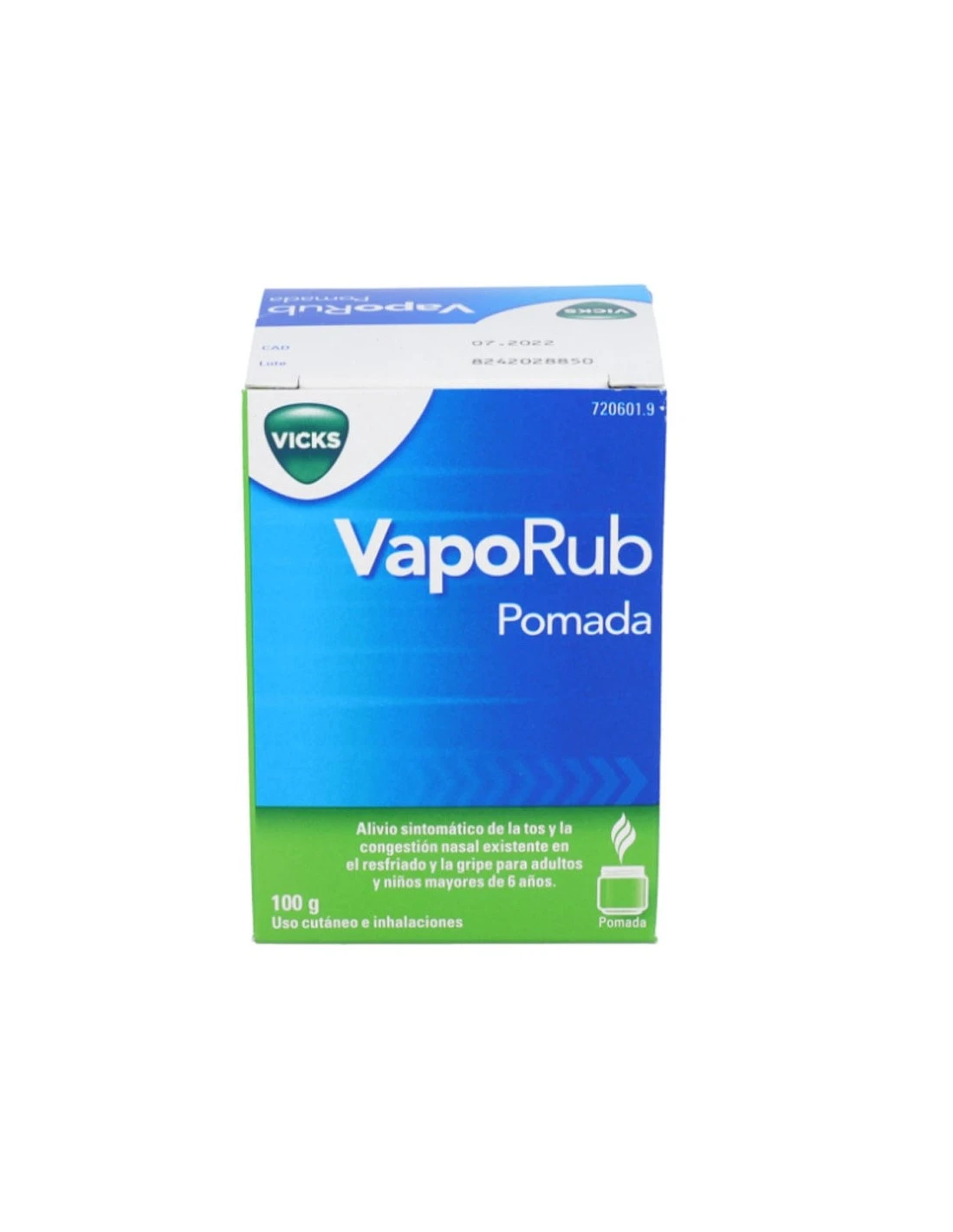 VapoRub es una pomada que se utiliza para el alivio sintomático de la tos y la congestión nasal existente en el resfriado y la gripe. Puede utilizarse directamente sobre la piel (uso cutáneo) o diluida en agua caliente para la inhalación de los vapores.