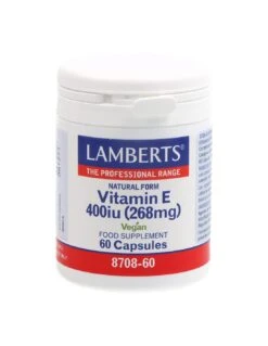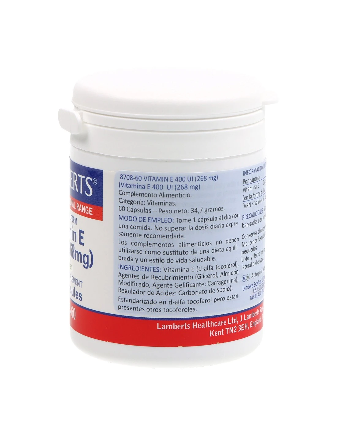 Lamberts Vitamina E Natural 400 UI es un suplemento diseñado para aportar una dosis óptima de vitamina E en su forma natural, d-alfa tocoferol, reconocida por su alta biodisponibilidad. Este nutriente esencial desempeña un papel crucial en la protección de las células frente al estrés oxidativo, contribuyendo al mantenimiento de la salud cardiovascular y de la piel. Cada envase contiene 60 cápsulas, proporcionando una fuente confiable de vitamina E para complementar la dieta diaria.